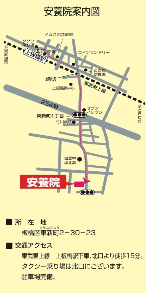 安養院アクセス 2023年9月2日 最終更新日時 : 2023年9月3日 wazaogi-dou 交通 板橋区東新町2-30-23 東武東上線「上板橋」徒歩15分国際興業バス「小茂根三丁目」徒歩3分 \ 最新情報をチェック / FacebookXBlueskyHatenaCopy
